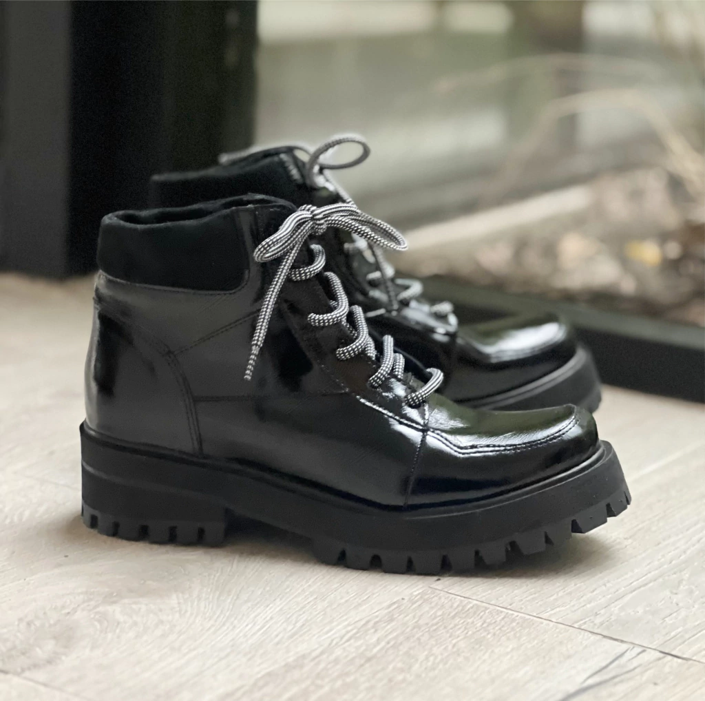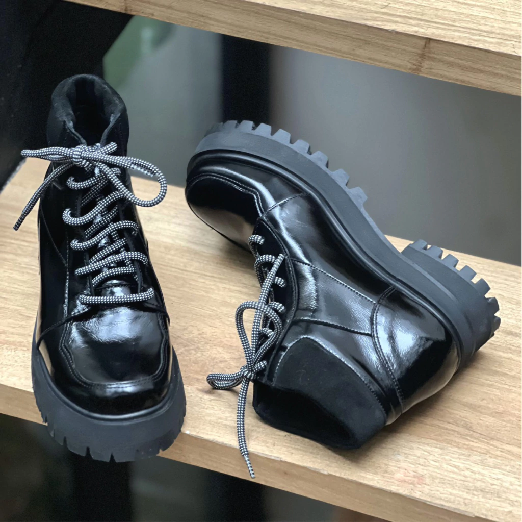 Es de charol negro (no es rigido, es super blando) con detalle de gamuzon negro!