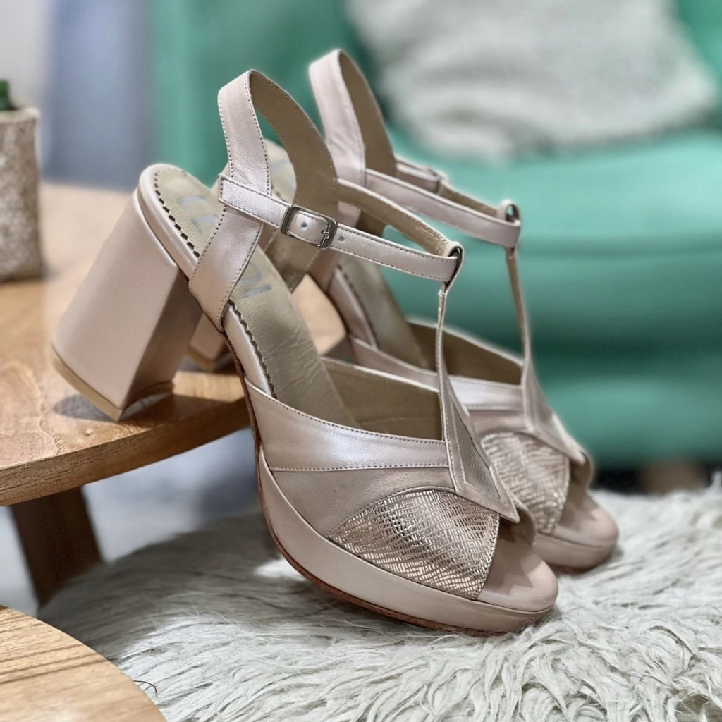 Nos pidieron tanto pero tanto este modelo con esta combinación que por fin cumplimos todos sus deseos 🥰 Cuero vacuno nude con una terminación nacarada, con recortes de cabra gamuzada y transfer nude ! Tiene forreria y suela vacuna Taco de 8 cm elefante (altura total de aprox 9 cm) Y plataforma de 2 cm. Es un producto artesanal y puede tener imperfecciones por ser piel natural !